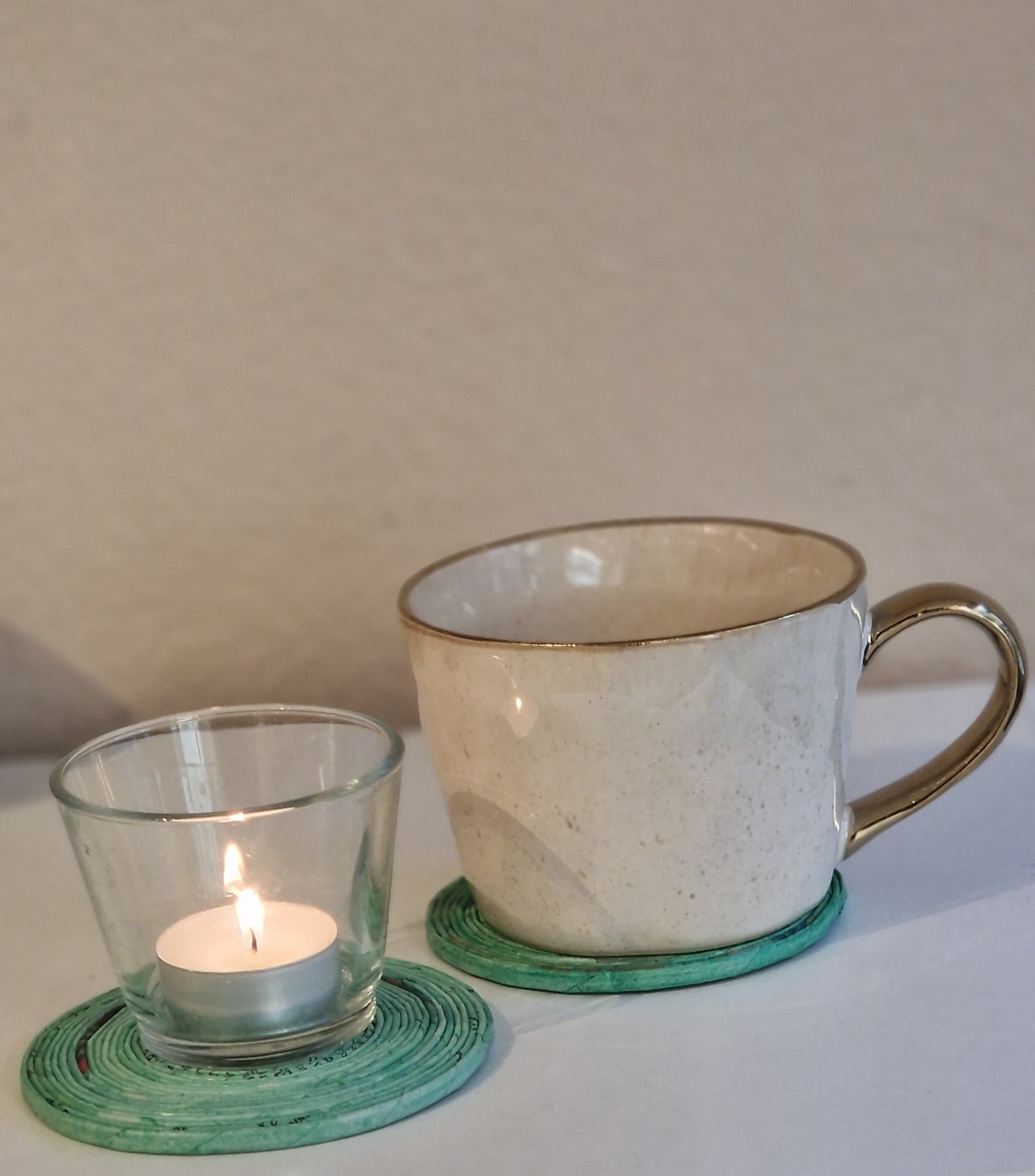 Nachhaltig produziert aus Zeitungen, in tollen Farben und wasserfest durch eine spezielle Lackierung, ist dieser Untersetzer der perfekte Begleiter für deine Tasse Tee.